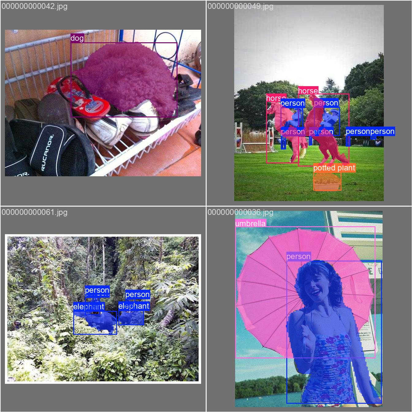 Segmentation은 목표 객체를 Mask안에 포착하는 작업이다. 예시처럼 이미지에서 객체가 차지하는 영역을 Mask 형태로 찾는다. 예시는 Box와 Mask 모두 찾은 결과이다.